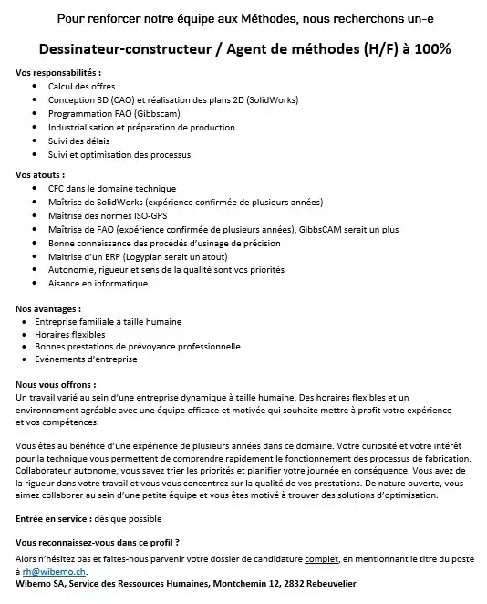 Pour tout autre poste, votre postulation spontanée peut être adressée à : rh@wibemo.ch